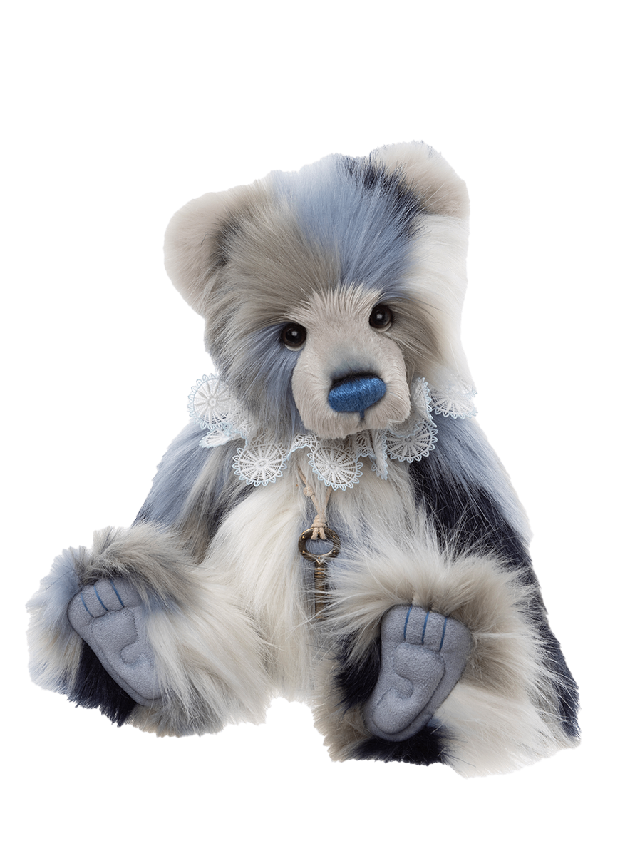 Meet Janine, a Cuddle Time Exclusive plush panda who exudes timeless charm and gentle grace. With her luxuriously soft, long-pile plush fur in a dreamy blend of blue, white, grey and black, she’s as cuddly as she is captivating. Her sculpted paw pads include charming tickly toe detailing, and her signature “Who, me?” expression is sure to melt hearts. Dressed to impress, Janine wears a delicate lace collar, paired perfectly with a “key to your heart” necklace. Suitable for ages 3 years+. Panda height: 41cm/16"/13.7 Bear Paws.