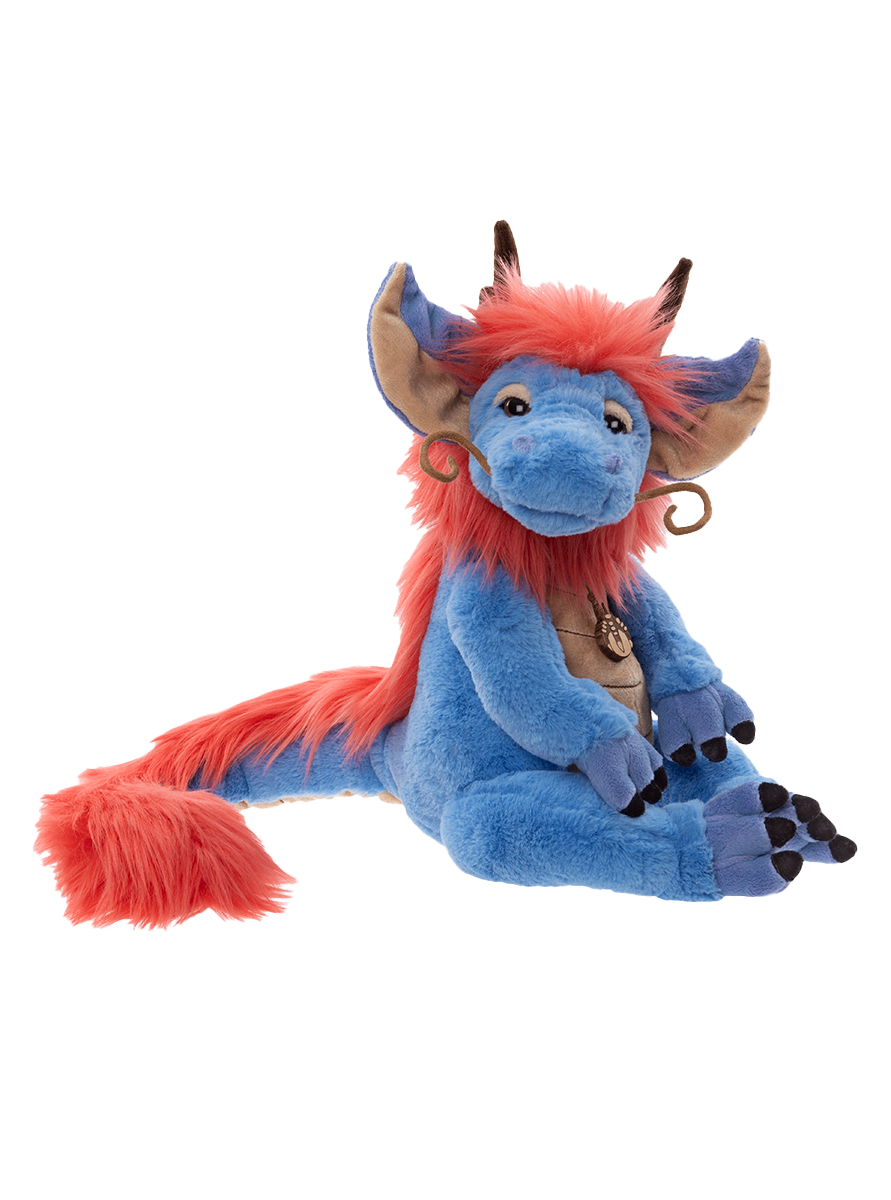 Meet Zen Zhu, a stunning member of our Signature Collection, inspired by the enchanting illustrations of Ali Montgomery. This majestic Eastern dragon is crafted from luxuriously soft blue and beige plush fur, with a long red fluffy "mane" that frames his face and flows down his back to the tip of his tail. Zen Zhu features intricate details including horns, whimsical curly whiskers, and a beautifully crafted necklace with a wooden pendant. If you’re captivated by Zen Zhu, don’t miss his equally charming friends, Eglin, Feldspar, and Mirren. Suitable for ages 14 years+. Limited edition of only 2000 pieces globally. Eastern Dragon height: 43cm/17”/14 Bear Paws.