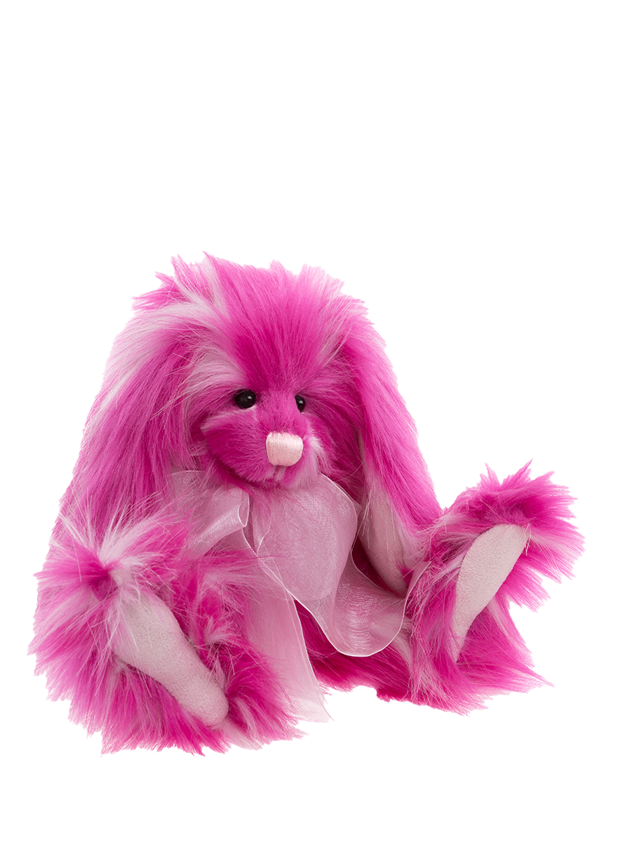 Raspberry Ripple is a bear-utiful bunny made from super soft long-pile raspberry pink plush fur with ripples of white. She has eyes that sparkle with personality, a dainty light pink hand-embroidered pink nose and wears an organza bow to match. With her vibrant colouring and oversized, soft ears, this bunny is sure to steal the spotlight. Look out for Raspberry Ripple's bear sibling, Raspberry Cupacke, they sit paw-fectly together! Suitable for ages 3 years+. Rabbit height: 28cm/11”/9.3 Bear Paws.