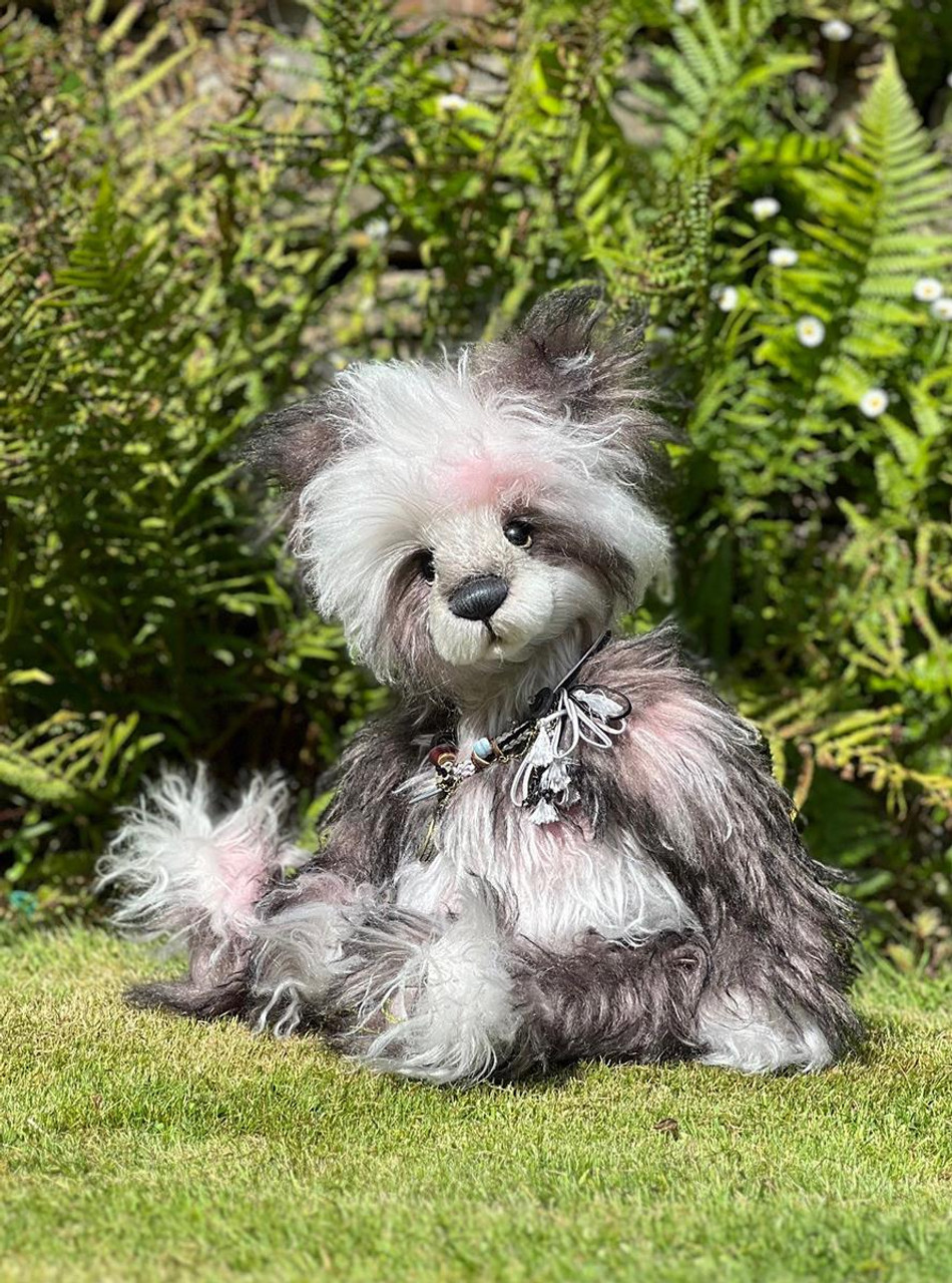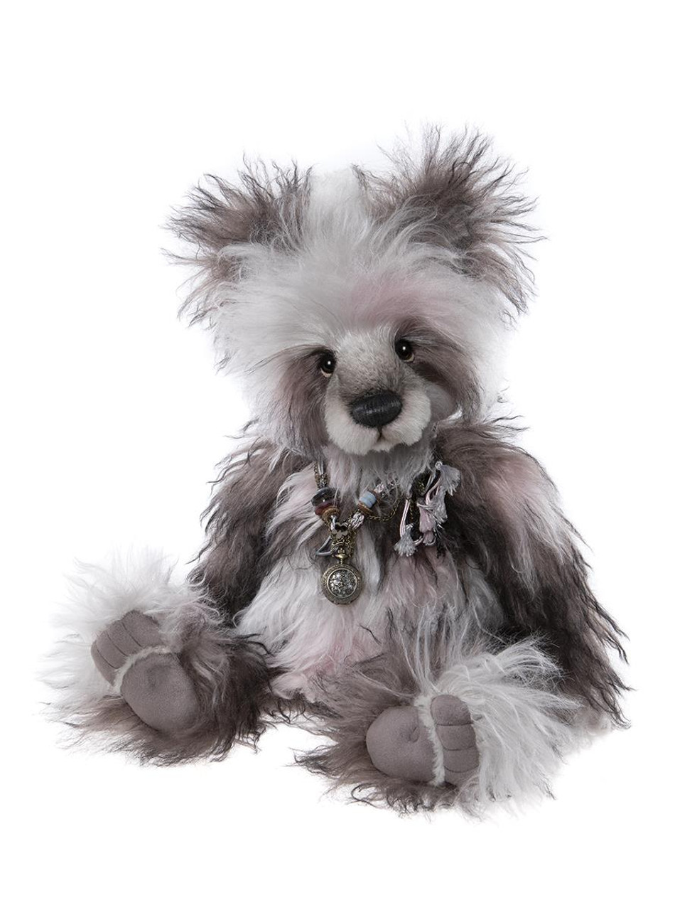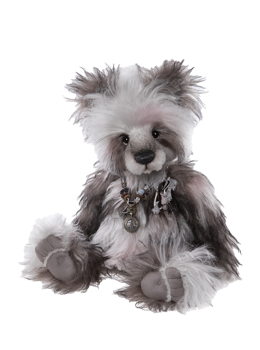Get lost in the beauty of Labyrinth, an exquisite, intricately detailed bear, named after the entire 2024 Charlie Bears Collection. Labyrinth is made from a blend of long pile mohair and alpaca in shades of dusty grey, soft rose and off-white tones. She wears a pocket watch pendant on a cord necklace, which has been heavily embellished with beads of various shapes and sizes, charms, and even a delicate chain. Suitable for ages 14 years+. Limited edition of only 250 pieces. Bear height: 53cm/21"/18 Bear Paws.