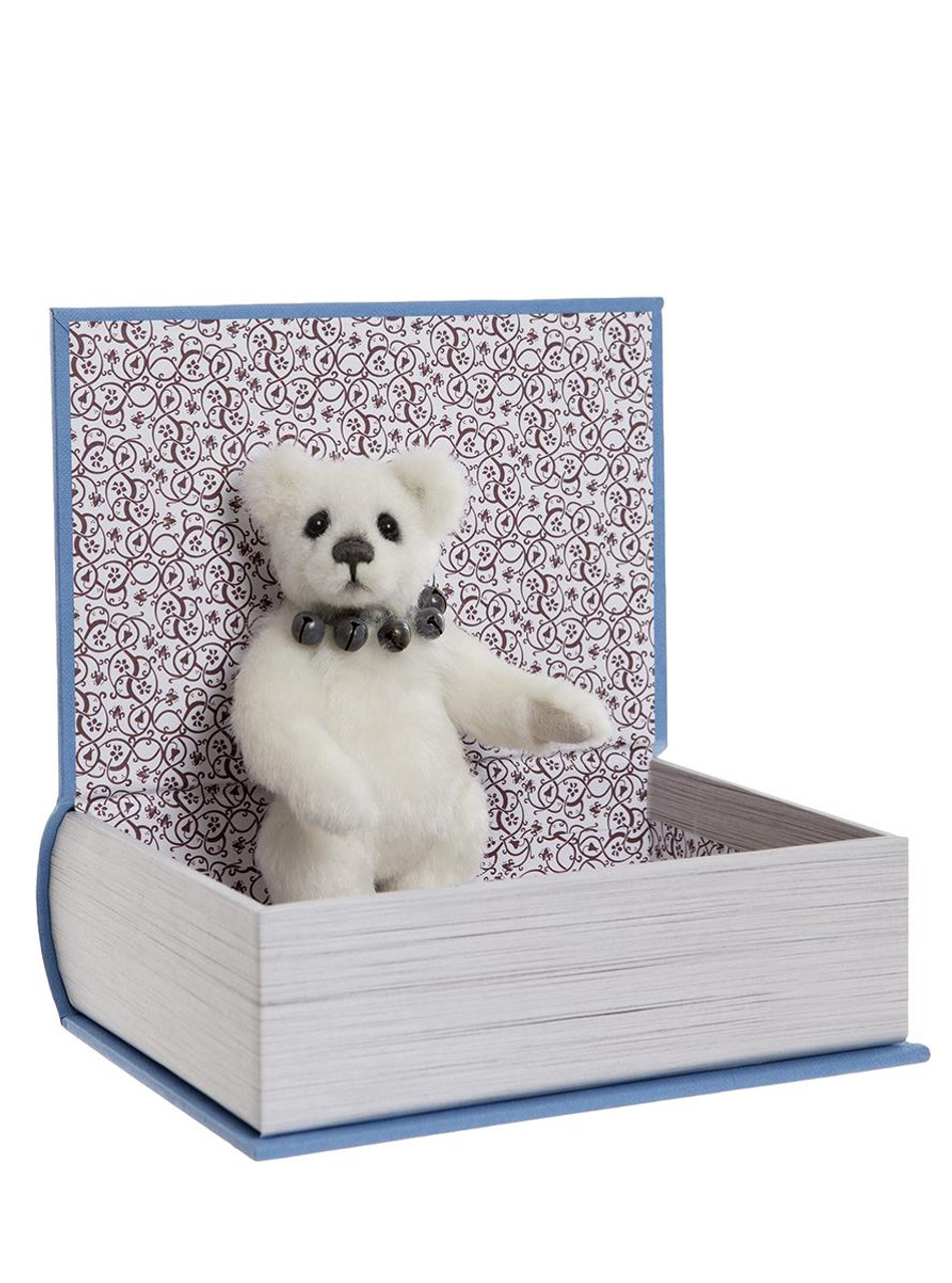 This tiny bear has been created using a cool iceberg white plush and is fully jointed and with tiny deep set eyes and a handstitched nose. He has soft tactile paw pads and a dinky bell collar tied with a shoestring. When not being a book worm, Study Buddy adores to travel and promises to not take up too much room in your bag or your pocket! Study Buddy has been created using synthetic plush, he has been fully tested to meet all relevant toy safety standards in The USA. Recommended for ages 3 years + . Bear cub height: 13cm / 5" / 4 Bear Paws