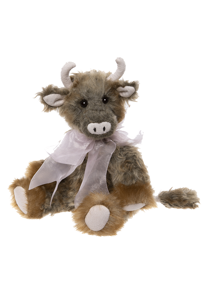 Prairie is an udderly adorable cow made from super-soft plush. Her textured coat showcases various shades of brown, contrasting beautifully with her majestic white horns, inner ears, nose and hooves. Completing her charming look is a pretty pink bow around her neck. For the most adorable duo, consider purchasing her friend Alpine as well. Suitable for ages 3 years +. Cow height: 30cm/12”/10 Bear Paws.