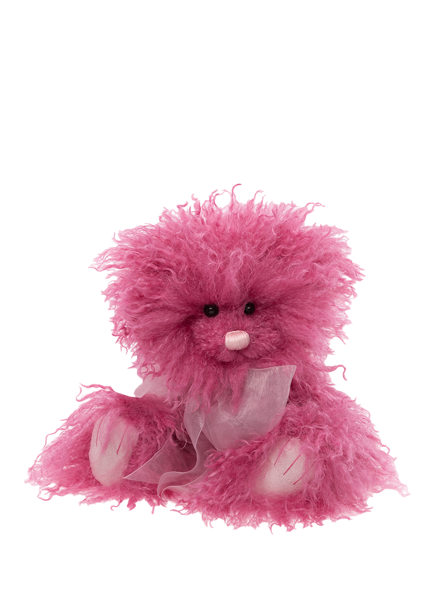 Fizz Bomb is a fun teddy bear with long-pile, wavy plush fur in a raspberry pink colour! She has a wonderfully wild and tousled look. With her extra fluffy texture, she offers maximum cuddle possibilities! Fizz Bomb features a hand-embroidered light pink nose on a shaved muzzle and light pink flat paw pads with tickly toe detailing. She is complete with an organza bow around her neck. Suitable for ages 3 years+. Bear height: 28cm/11”/9.3 Bear Paws.
