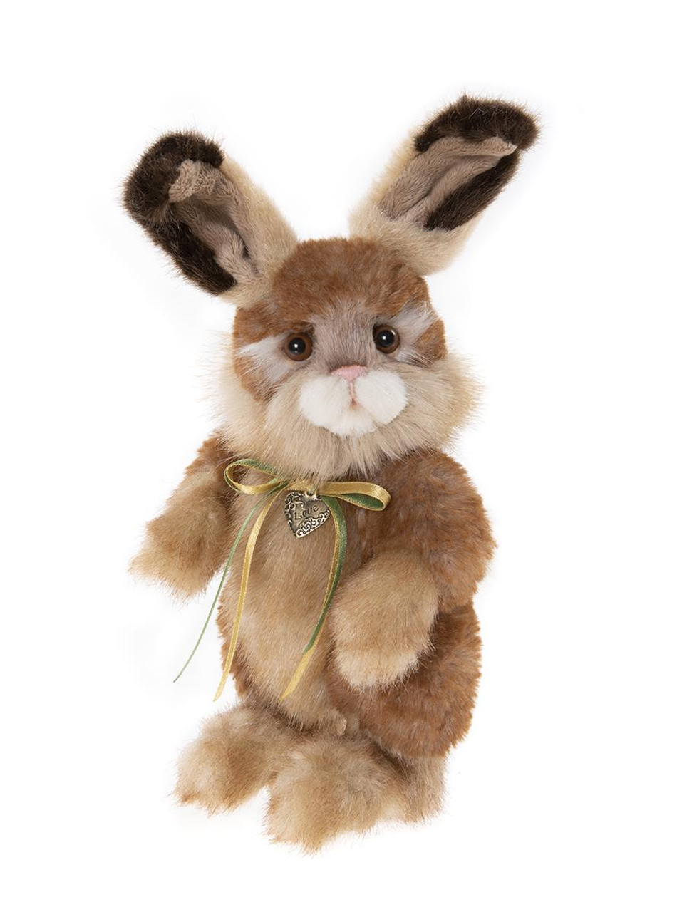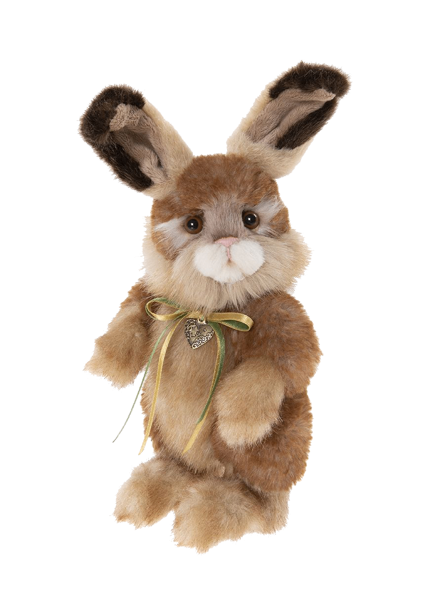 This adorable little bunny is named Chick Pea from our Secret Collection. Chick Pea has been created using a number of different plush fabrics in lovely golden brown and cream tones. This sweet bunny has a hand stitched mouth and nose and also has flat feet so he is able to stand on his own. Around his neck, he wears a double ribbon tied into a bow which holds on to a heart shaped pendant. Recommended for ages 3 years +. Rabbit height: 20cm/8"/7 Bear Paws.