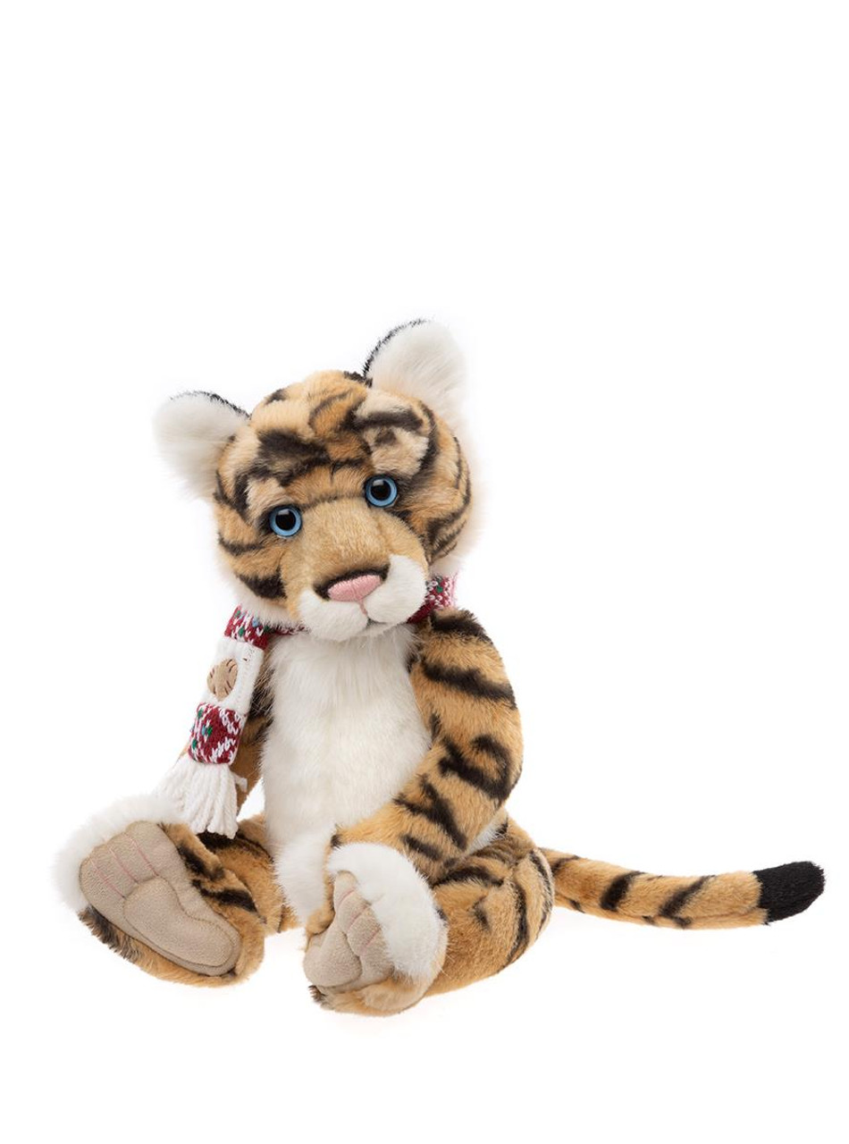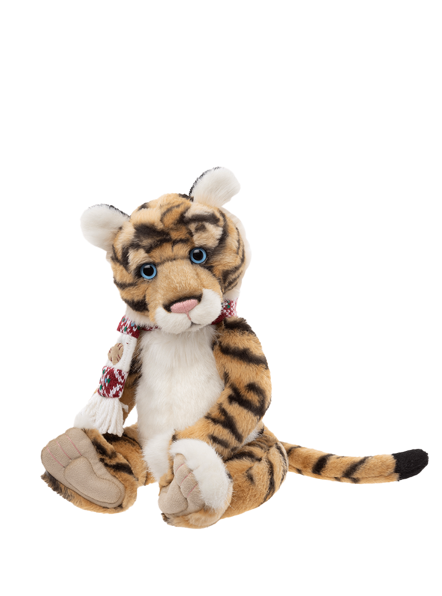 Taradiddle is part of our extra-special Paw Store Exclusive Collection, meaning you’ll only find her at our Charlie Bears Paw Stores. This enchanting tiger is crafted from sumptuously soft plush fur in rich golden tones, adorned with bold black stripes, a snowy white tummy, and other delightfully fluffy white accents. With beautifully sculpted paws featuring tickly toe detailing, soulful blue eyes, and an endearing face, Taradiddle is bursting with personality and simply longing for cuddles. She comes dressed for comfort and charm in a cosy red and white knitted scarf - perfect for snuggly days. Recommended for ages 3 years+. Tiger height: 38cm/15"/12.7 Bear Paws.